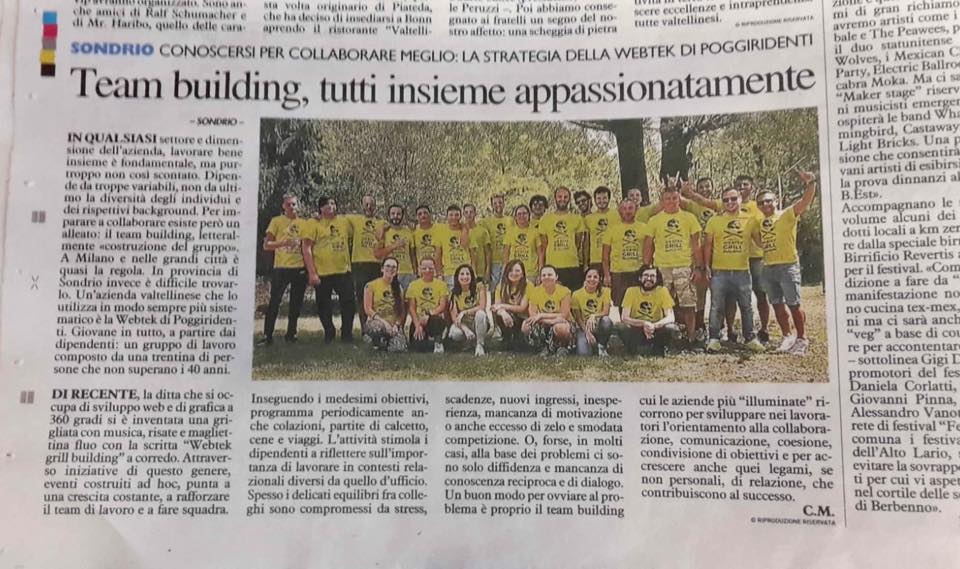 Come da tradizione, ogni estate Webtek organizza un grande evento dedicato ai propri dipendenti. E' un'occasione significativa, pensat e voluta per favorire il team building e rafforzare le relazioni all'interno del gruppo di lavoro.